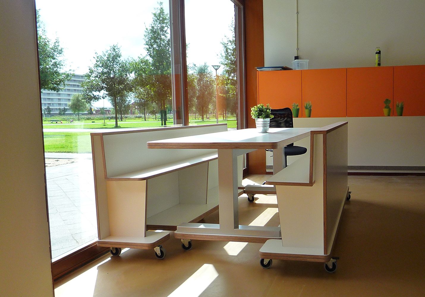 Tafel met banken en een kast voor een buitenschoolse opvang. Vanwege het multifunctionele karakter van de ruimte was de wens om het meubel verplaatsbaar te maken. Het bijzondere van dit meubel is dat de tafel en banken in elkaar geschoven kunnen worden (zonder dat delen elkaar raken) tot een compact ‘blok’. Het geheel is zo makkelijk verrijdbaar. Zowel de tafel als de kast is gemaakt van berkenmultiplex voorzien van HPL. Materiaal dat tegen een stootje kan en in vele kleuren verkrijgbaar is.
