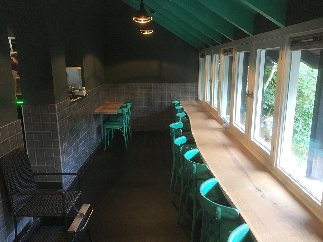 Tafels voor een restaurant/kantine in een kantoorpand. De tafelbladen zijn gemaakt van rustiek eiken. De opdrachtgever wilde lichte tafels die demontabel en makkelijk te verplaatsen zijn. Daarom is gekozen voor eiken dikfineer waardoor de tafels licht van gewicht zijn.