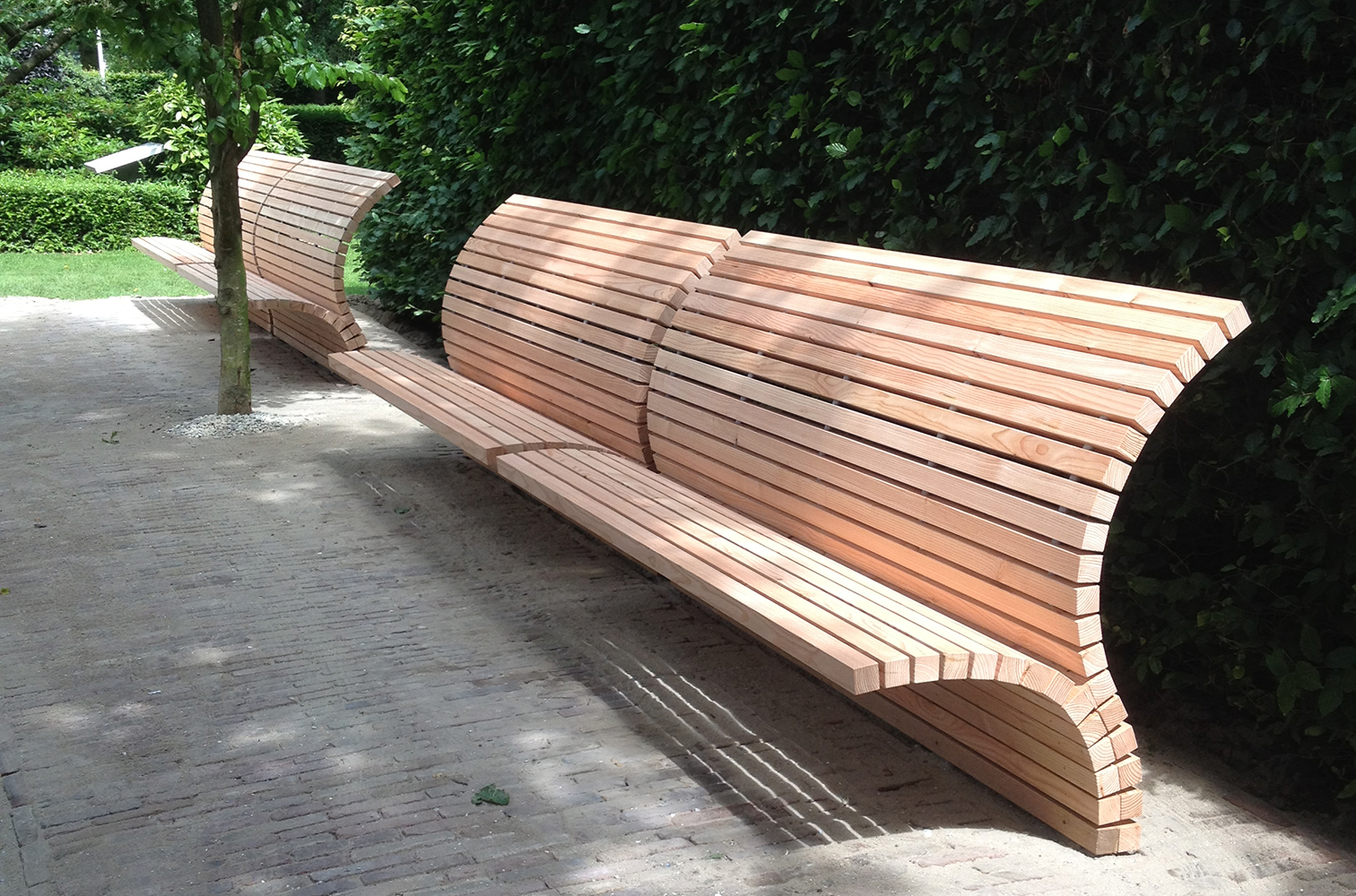 Buitenbanken gemaakt van duurzaam larikshout van Landgoed Scherpenzeel. Het hout is onbehandeld en krijgt na verloop van tijd een grijsachtige teint. De banken zijn ontworpen voor de begraafplaats St. Barbara in Utrecht. Met behulp van een ‘zitmachine’ heb ik de ideale zitvorm gemaakt die is afgestemd op de oudere bezoekers van de begraafplaats. Voor dit ontwerp won ik een IMI-award.