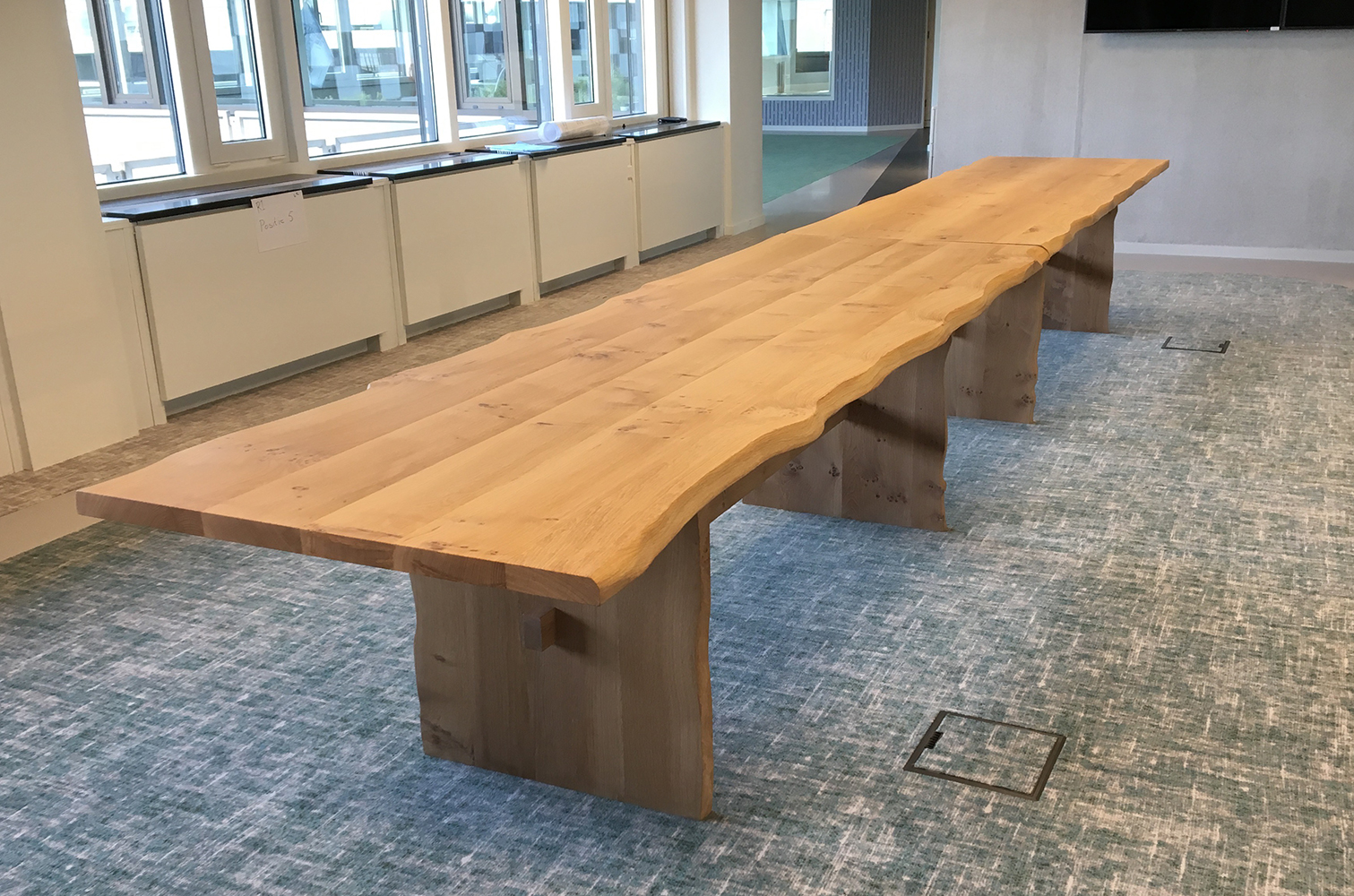 Deze lange tafels zijn ontworpen om aan te werken en vergaderen. De langste tafel -bestaande uit twee delen – is maar liefst 5,90 meter. Ze zijn gemaakt van inlands eiken en behandeld met olie. Het mooie van dit project is dat er gebruik is gemaakt van ‘scharrelhout’. Dat wil zeggen dat de stam lokaal is gekocht, gezaagd, gedroogd en verwerkt door Meubelminded. Alle tafels zijn afkomstig uit een stam.