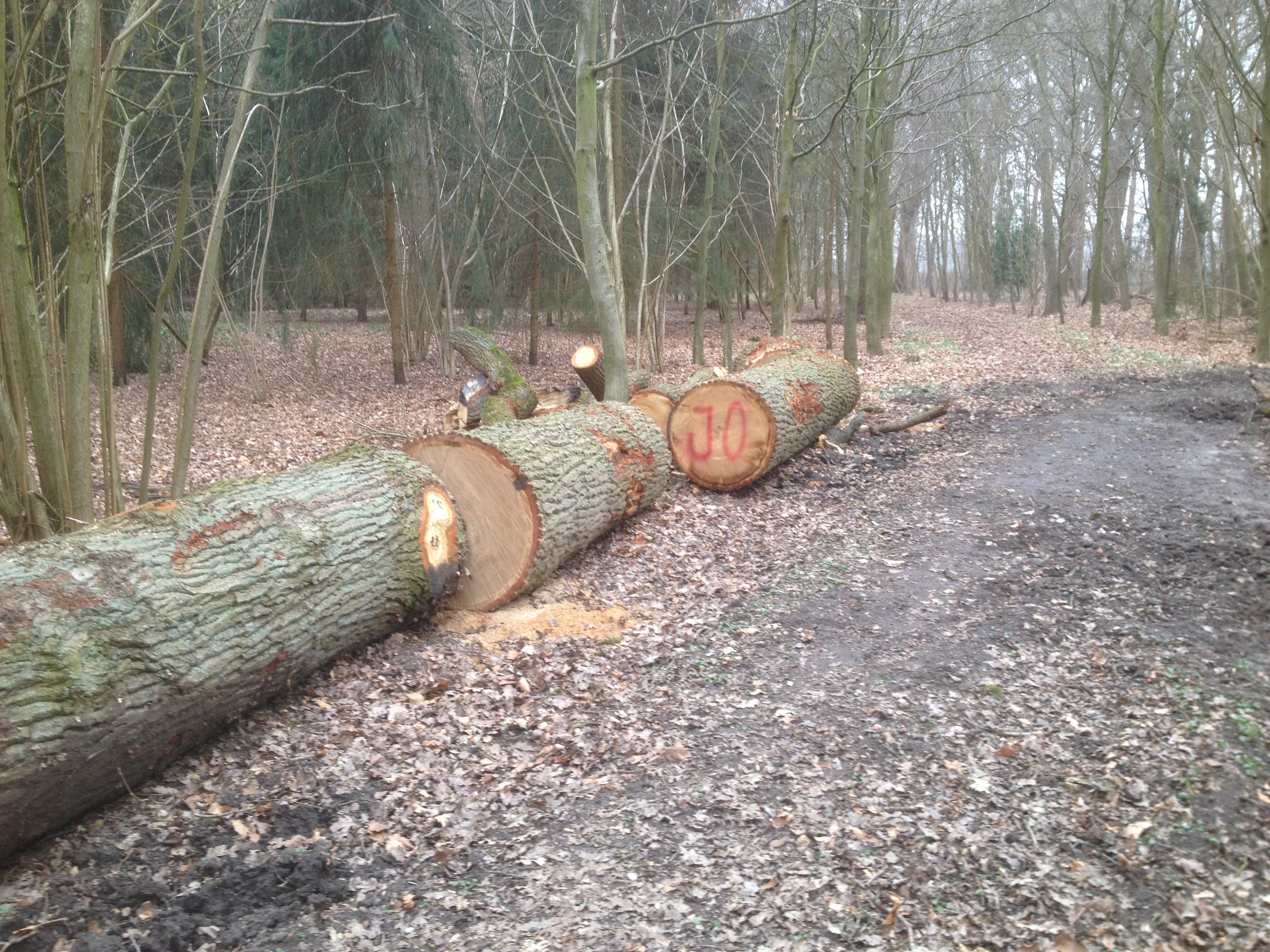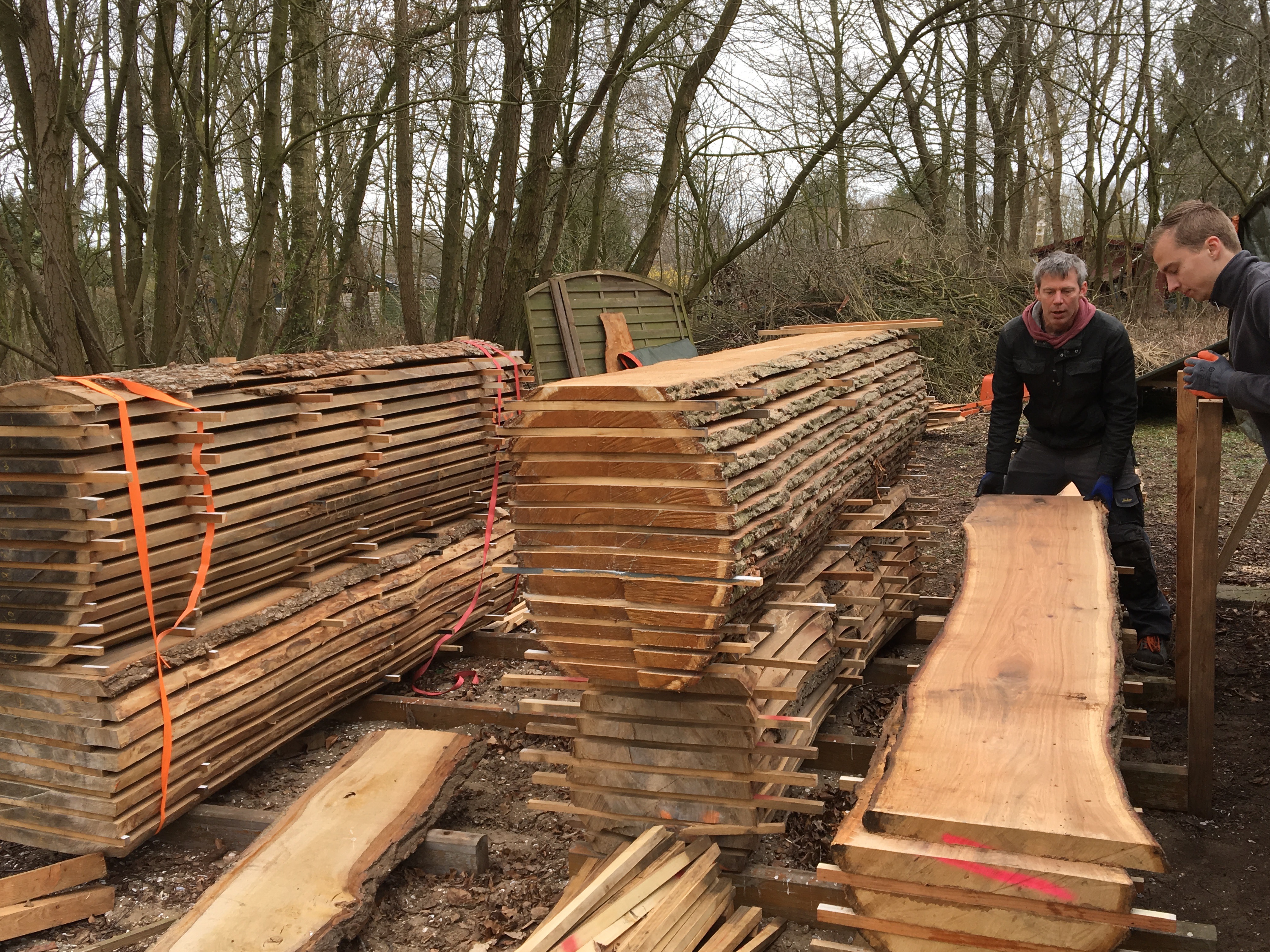 Scharrelhout is de naam die ik heb gegeven aan het hout dat ik zelf bij elkaar heb gescharreld uit de lokale omgeving. Het is ooit begonnen met de bomen die vlakbij mijn werkplaats aan de A12 stonden. Ze moesten wijken voor de verbreding van de snelweg. Zonde, dacht ik, dat wordt allemaal haardhout. Ik kocht enkele stammen (eiken en essen) en zaagde ze met een Woodmizer tot planken van verschillende diktes. Daarna latte ik ze op en liet ze een tot twee jaar drogen in de buitenlucht. Vervolgens liet ik ze binnen verder drogen tot er meubels van gemaakt konden worden.